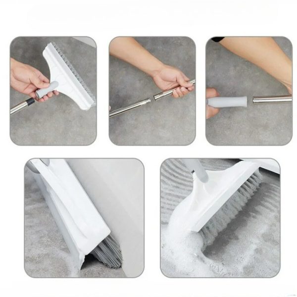 El diseño en forma de V limpia las juntas, los rodapiés y las esquinas estrechas que las escobas estándar pasan por alto. El lado plano sirve para las superficies del baño, ventanas y suelos despejados: todo con una sola herramienta.